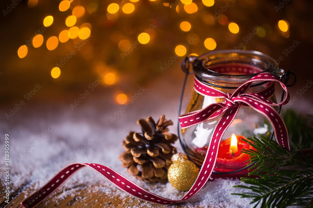 Fotografia Advent, Christmas – Burning Candle In Snow Landscape With Bokeh Background
