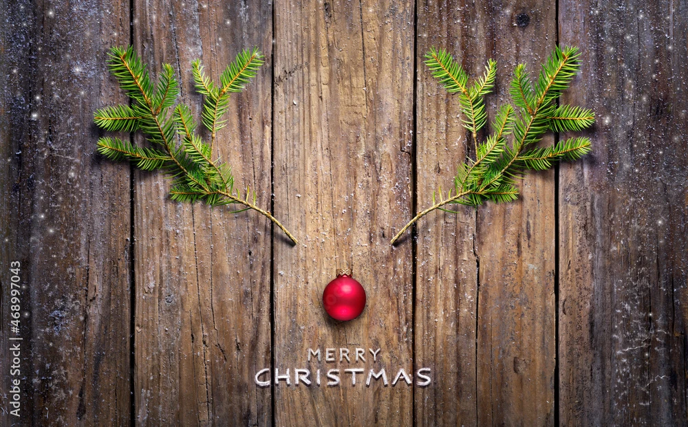 Fotografia Christmas Concept – Reindeer Made With Fir Branches And Red Ball On Wooden Plank
