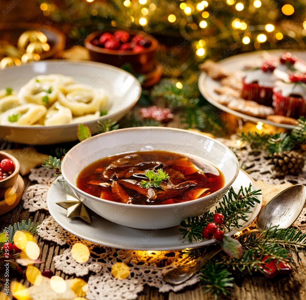 Fotografia Christmas Mushroom Soup, A Traditional Vegetarian Mushroom Soup Made With Dried Forest Mushrooms In A Ceramik Plate On A Festive Table