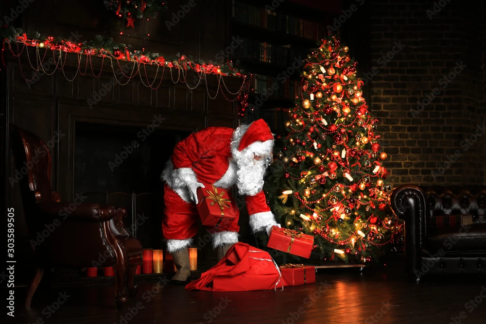 Fotografia Christmas Night, Santa Claus Puts Gifts Under The Tree