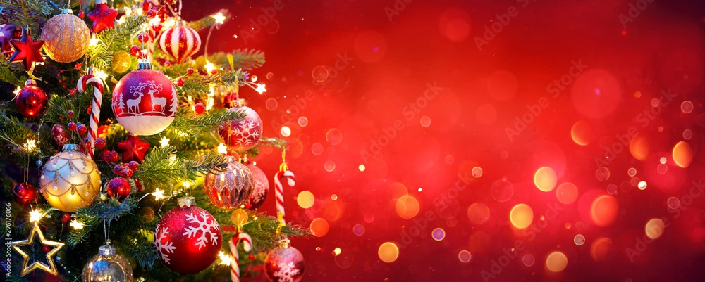 Fotografia Christmas Tree With Ornament And Bokeh Lights In Red Background