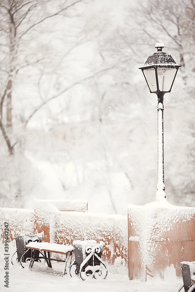 Fotografia Landscape Bench In City Park Winter Frost, Christmas Morning In The City