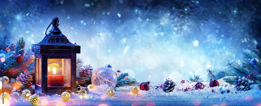 Fotografia Snowy Lantern With Fir Branches And Baubles – Christmas Card